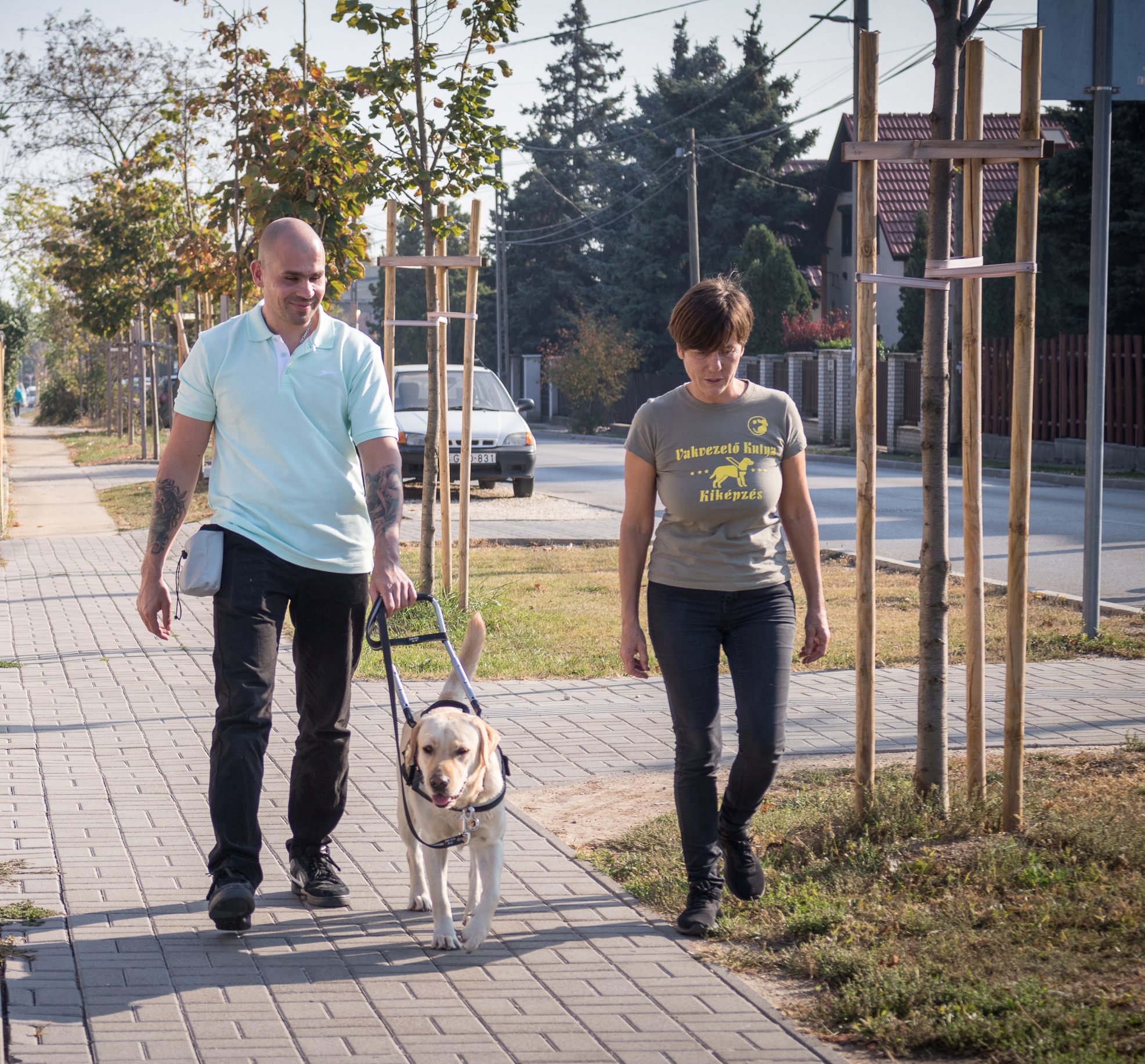 „Gyerekkorom óta gyengén látok, de azért sokáig képes voltam saját magam közlekedni és élni az életem. Három éve azonban volt egy szürkehályog műtétem, ami nem sikerült túl jól. Ekkor döntöttem úgy, hogy beadom az igénylést egy vakvezető kutyára. Eljött az a pont, hogy nem mertem elindulni sehová, mert nem éreztem magam biztonságban. Attól rettegtem, hogy valamit „benézek”. A fehér botnak azonban a gondolatától is irtóztam, nekem túlságosan a vakság szimbóluma. Én viszont szeretném közel úgy élni az életemet, mint egy látó ember. Elgondolkodtam és számba vettem a lehetőségeimet, és így jutottam el egy négylábú segítőtárs gondolatáig. Már gyerekként is volt kutyánk, mindig szerettem az állatokat, megvolt velük a kapcsolatom és számomra hozzátartoznak a család életéhez. Így nem éreztem többé kérdésnek: ez a legjobb döntés. Ráadásul, ha az utcán megy egy fehér botos és egy vakvezető kutyás ember, akkor is azt látjuk, hogy az utóbbi tényleg szárnyal. Egy hasonlattal élve, az előbbi szerintem olyan, mint egy személyvonat, utóbbi pedig egy interncity. És tudom, hogy a segítőtársam vigyáz rám, ami miatt óriásit nőtt a biztonságérzetem. Plusz nem feledkeztem meg a hétéves gyerekemről sem, akiért felelősséggel tartozom” – magyarázta az érzéseit Csúzda Zsolt, aki látássérültként mindig megpróbálja kihozni az életből a legjobbat.