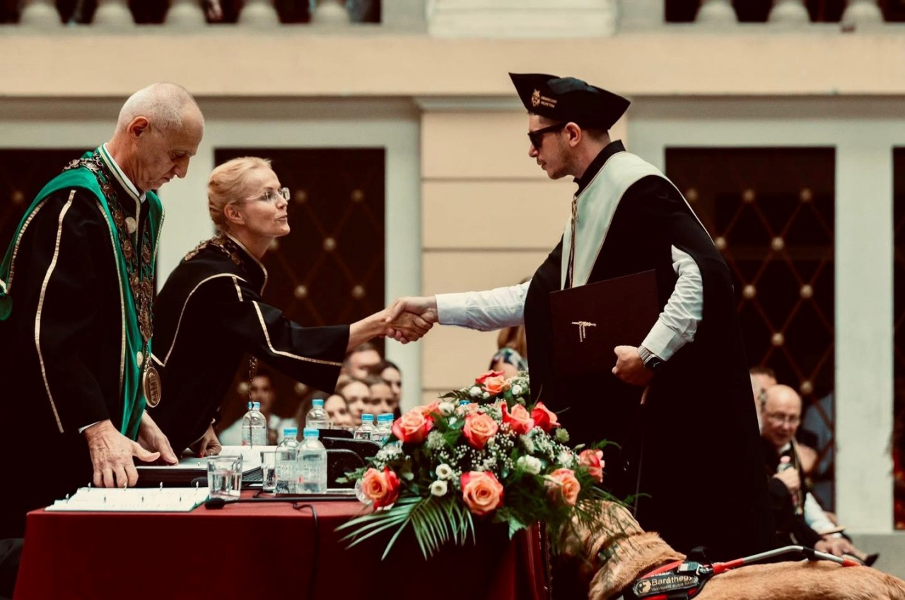 Parfé gazdája, Bodnár Attila nemrégiben szerezte meg sportközgazdászi diplomáját. A hűséges négylábú, akit a Baráthegyi Vakvezető és Segítő Kutya Iskola képzett ki, ugyanis minden alkalommal gazdájával tartott, amikor ő felkerekedett Veszprémből, hogy a debreceni iskolába induljon.
