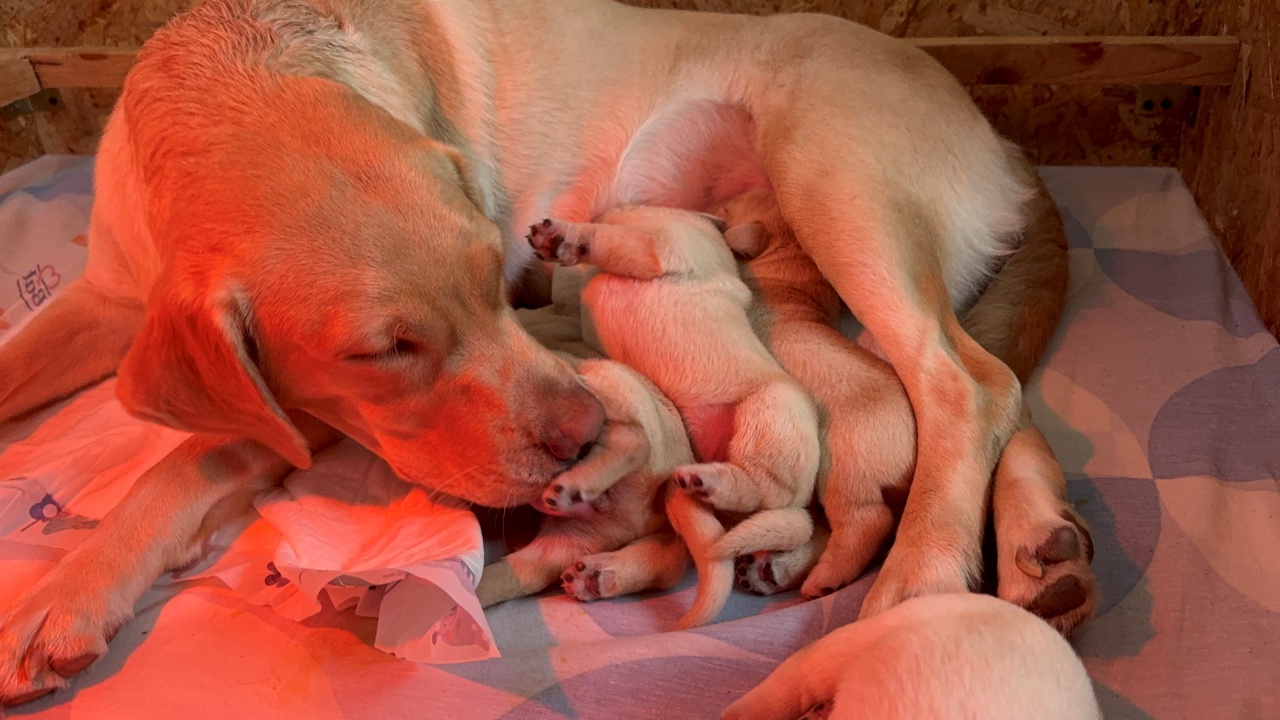 A kölykök most még csak az anyjuk mellett töltik napjaikat, a 2. héten kezd el kinyílni a szemük és a fülük.