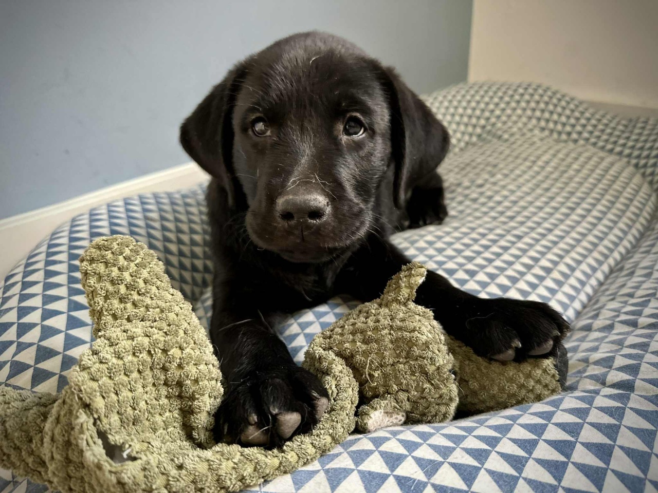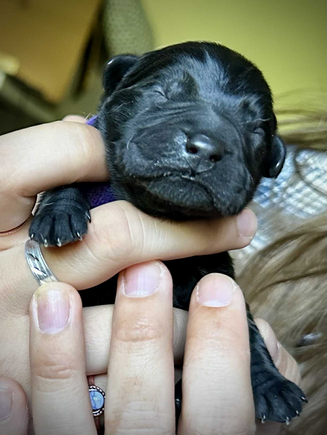 Keresi és kedveli az emberek társaságát, ő a legnagyobb termetű az egész alomban. Vidám, végtelenül nyugodt, nyitott kiskutya. Szereti a játékokat, a labdát, és ha megtömte a pocakját, szívesen alszik hason elnyúlva.