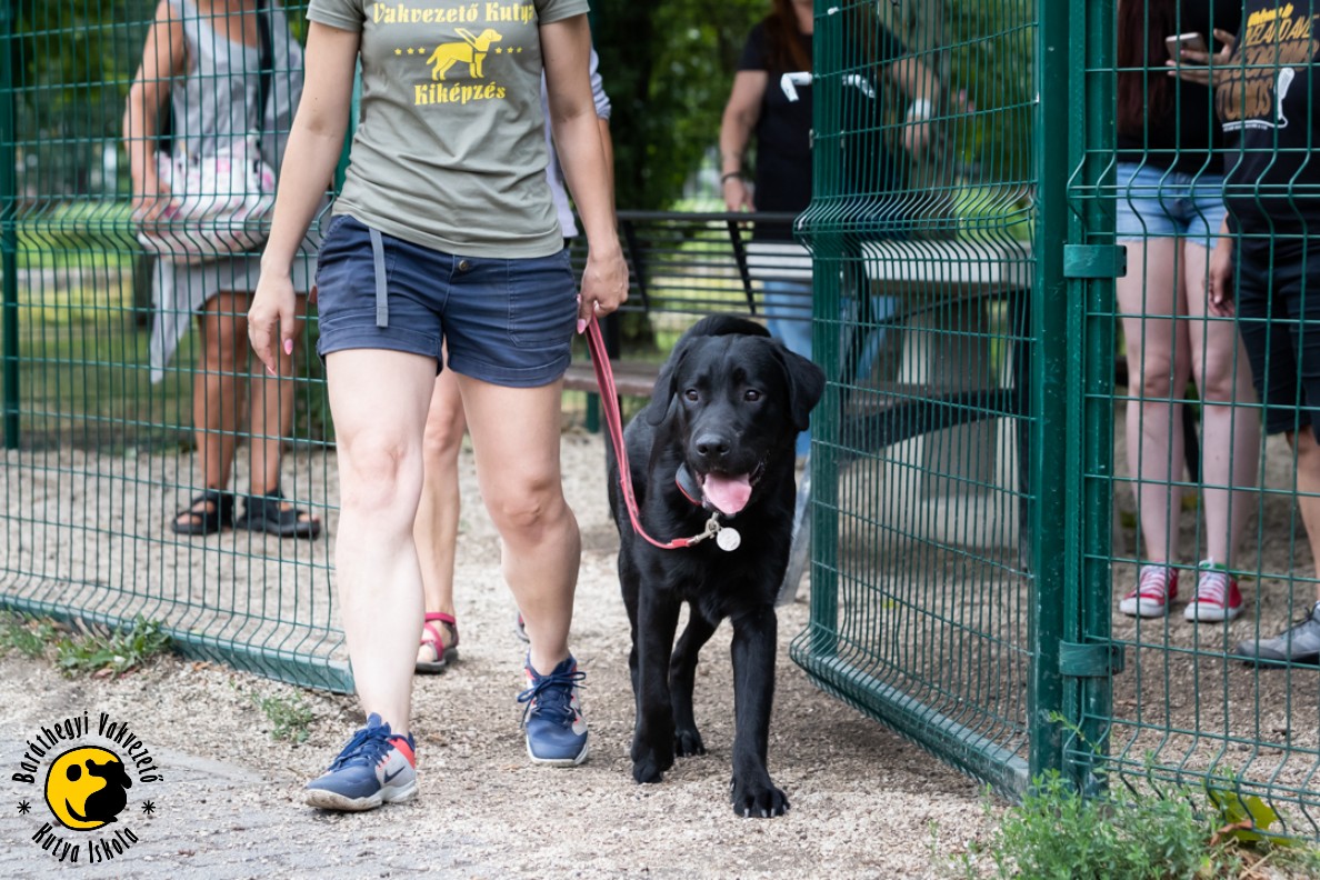 „Hagyd, hogy hibázzon a kutya, abból fog tanulni” – mondja kiképzőnk, Nyíriné Kovács Mária, miközben egyesével lépnek ki a futtatóból a kutyák és a kölyöknevelők. A cél az, hogy a kutyák a nyitott kapu láttán is higgadtan üljenek, hagyják, hogy a gazdik kilépjenek az ajtón, és csak vezényszóra kövessék őket. Akinek nem sikerül, az többször is nekifut, de végül mindenki kijut.