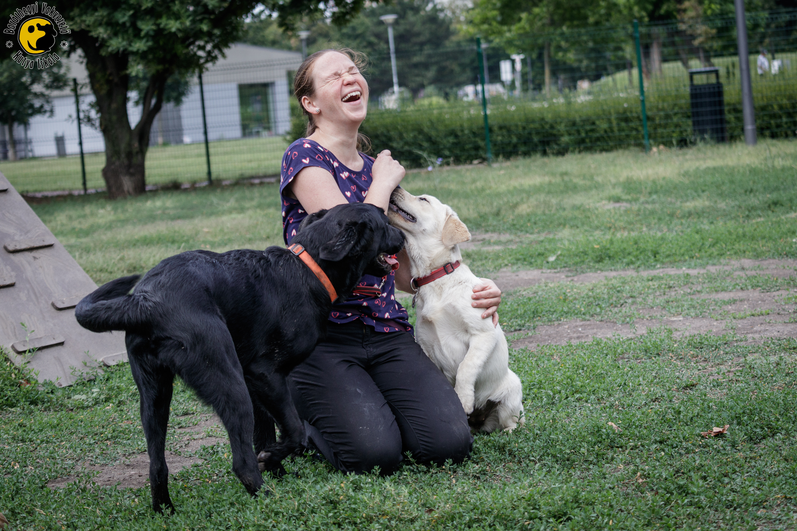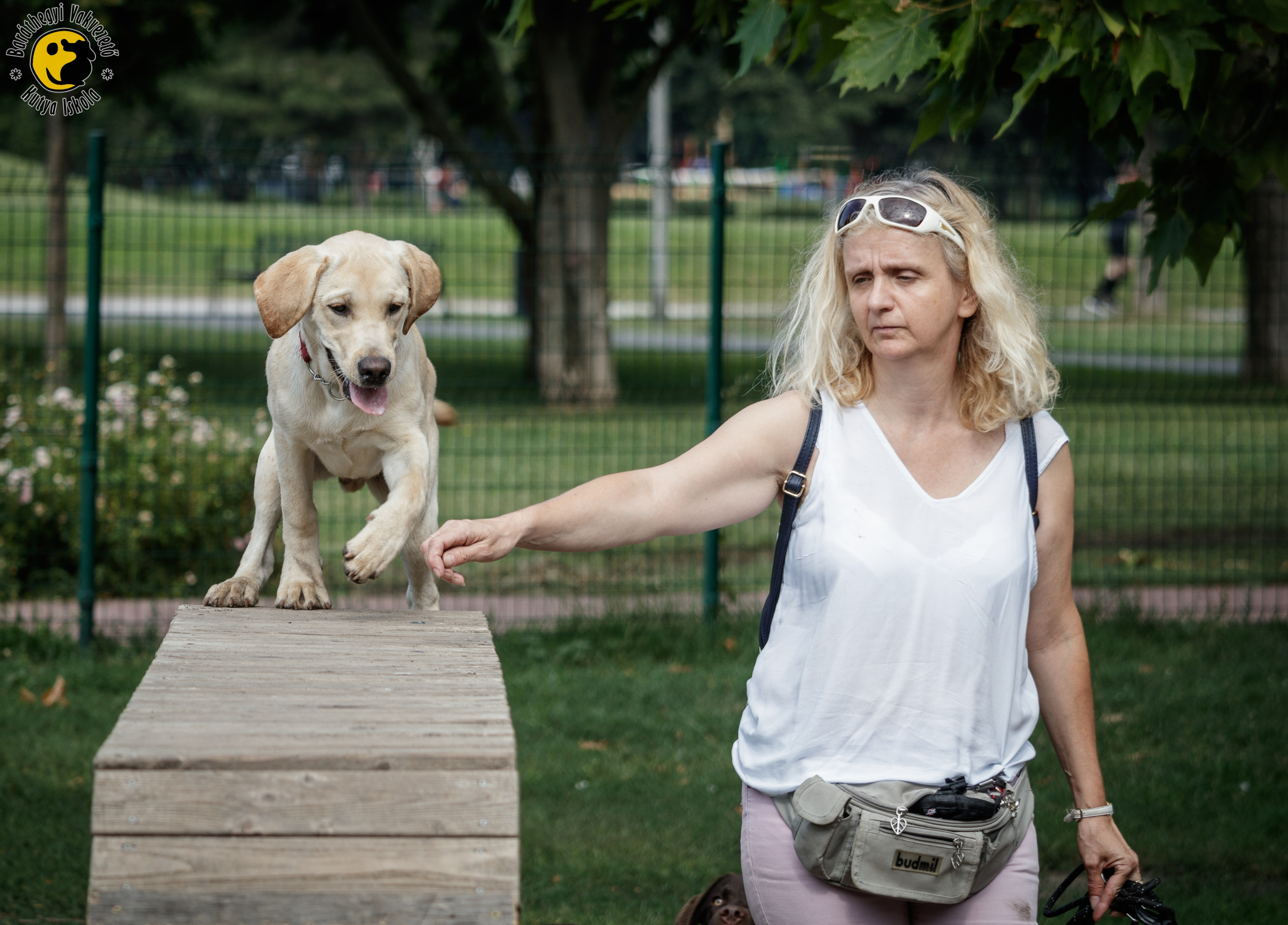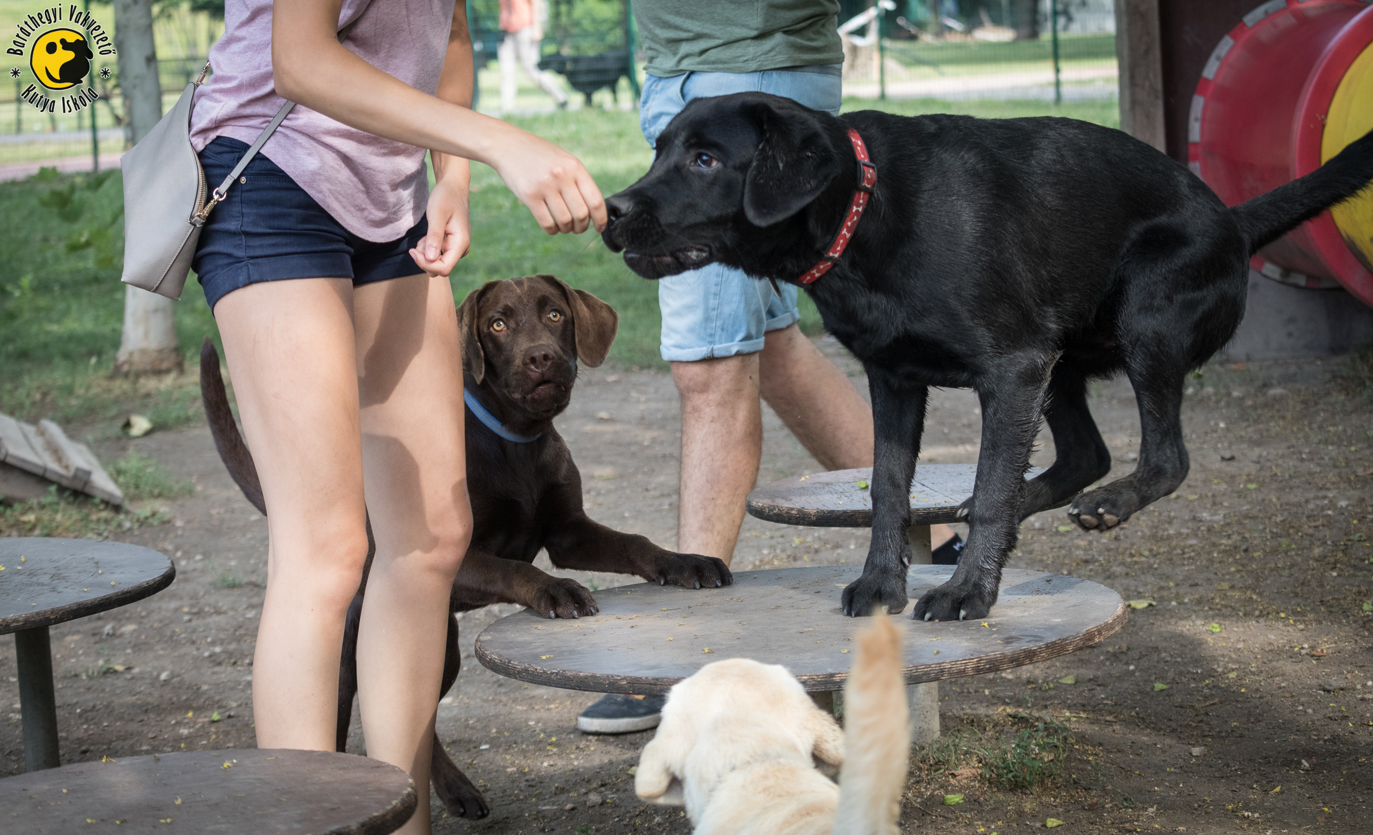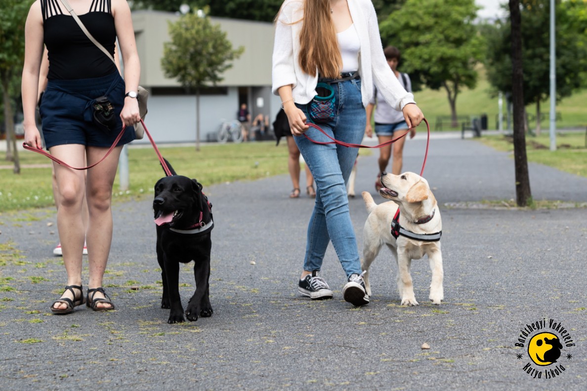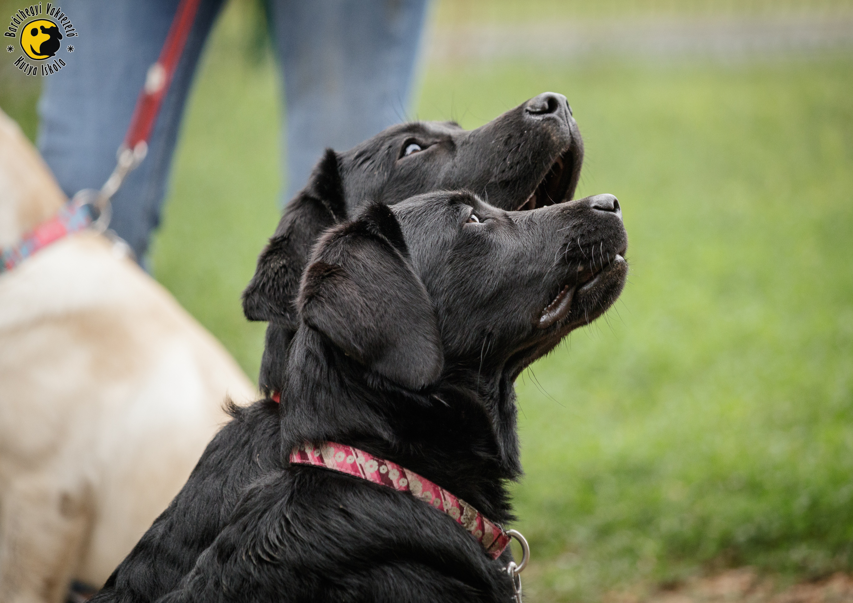 „Válj eggyé a kutyával” – mondta szakmai vezetőnk, Komondi Piroska, miközben megmutatta, hogy lehet úgy irányítani a pár hónapos Müzlit, hogy a kis labradornak ez fel se tűnjön, és a rengeteg külső inger ellenére magabiztosan és teljes elfogadással kövesse nevelőjének minden lépést.