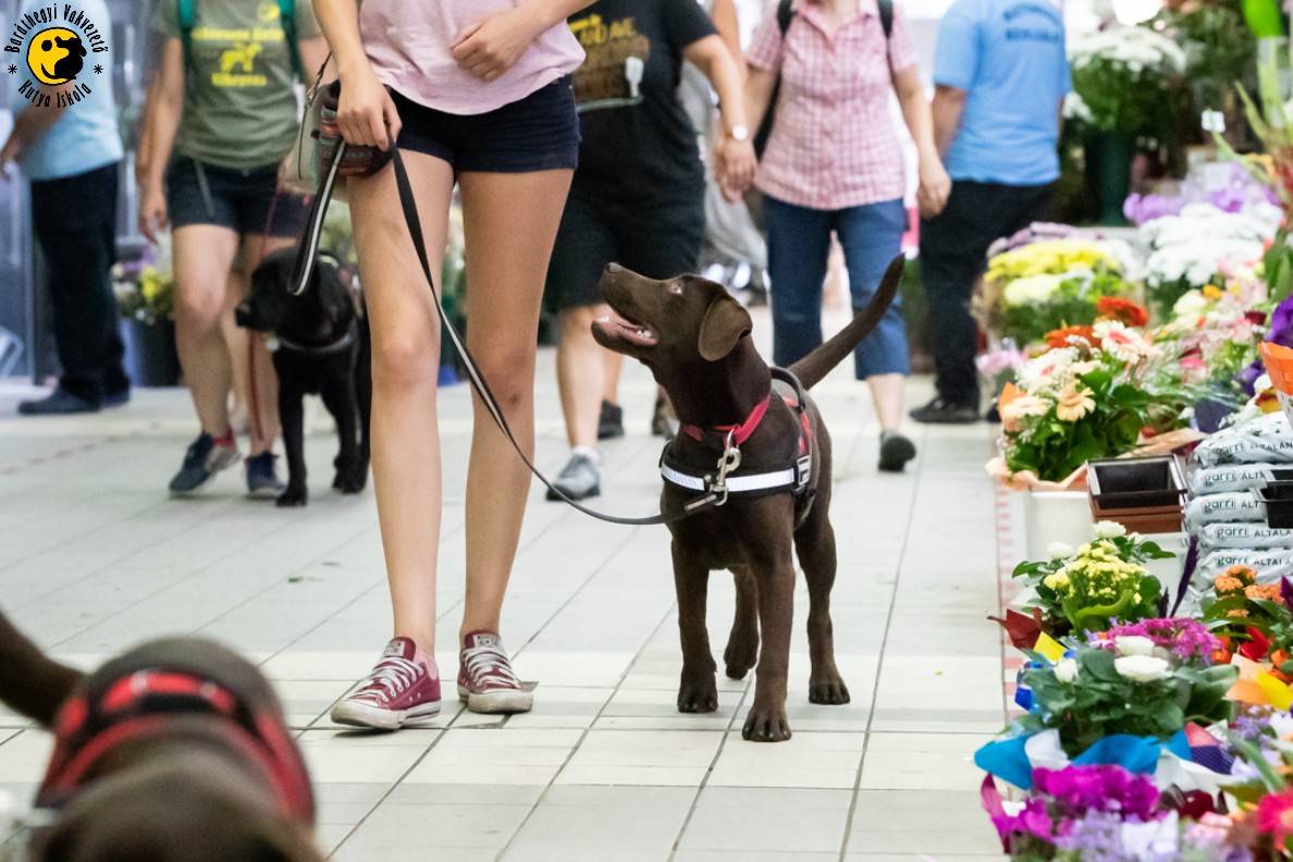 Végül a bevásárlóközpont előtt Királyné Barkóczi Emese és Nyíriné Kovács Mária segítségével kölyöknevelőink gyakorolták a kutyák láb mellé ültetését és a helyben maradást, ami nem volt egyszerű feladat, hiszen sokan odajöttek, hogy megsimogathatják-e a kutyákat. (Ezúton is szeretnénk megemlíteni, hogy munka közben nem szabad zavarni se a vakvezető kutyákat, se azokat, akik még tanulnak.) De azért nincs okunk a panaszra, összességében nagyon pozitív élményekben volt részünk, a vásárlók igazi látványosságként tekintettek ránk, többen megálltak fotókat készíteni, és persze folyamatosan visszhangzott a „jaj de okosak” és „de aranyosak” mondatok.