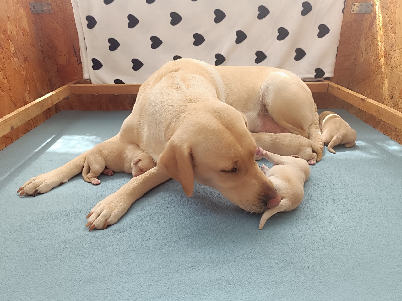 The puppies are developing beautifully and have great appetites — all of them now weigh over 550 grams. The little female is the smallest, but only slightly behind the others. Azúr is recovering very well. She occasionally steps away from the litter to say hello, but quickly returns to her puppies.