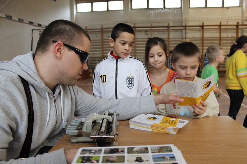Then our colleague Zoli personalised our brochure with Braille and even gave a few presents to the pupils. Meanwhile, Zoli’s guide dog Fanni was being caressed.