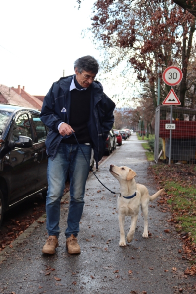 Akac spent 2 weeks in Vac with a couple who already have a guide dog, Kiwi. The two dogs got on like a house on fire from day one: they played together, they slept together. Akac – being such a young dog – didn’t understand that his host was blind and sometimes was lying in the middle of the hall and got in his host’s way who had to gently nudge him away with his feet. The young dog soon seem to have learnt how not to get in the way by the end of the 2 weeks.
