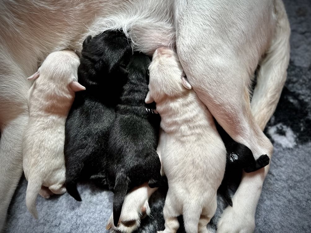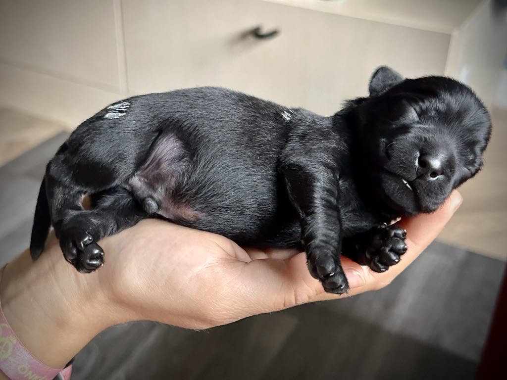 The puppies were born in a “wasp pattern”: black, yellow, black, yellow, black, and all boys. The smallest one weighed only 200 grams, less than half the size of his biggest sibling. However, this does not stop him from doing anything: he is lively, strong, and knows what he wants: to fill his belly as much as possible so that he can bring his brothers in. Today, at 6 days old, he has more than doubled his birth weight.