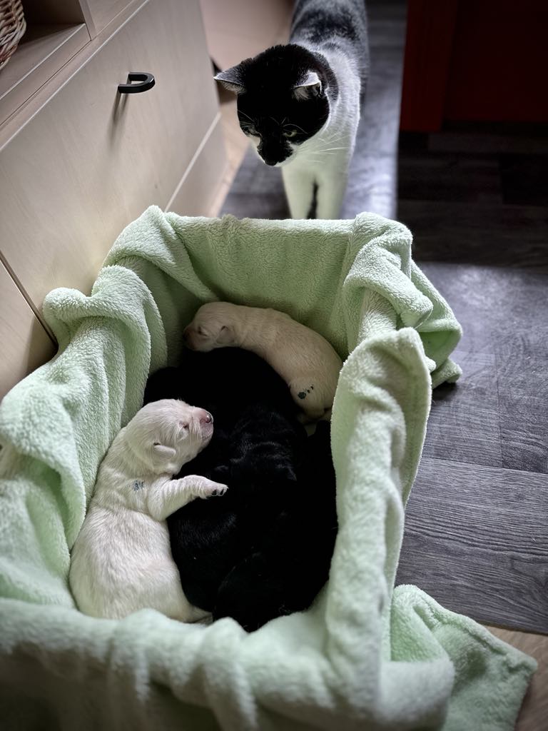 “The birth was quick and peaceful. The first signs of labor began to appear late in the evening, and the little ones arrived in a row at dawn the next day. Darázs is also a natural talent in this,” said Nadinka, Darázs’s foster owner. “The presence of Piroska Komondi and Gizella Ménesi gave me great security, all the more so because they were already present at Darázs’s birth. Piros is our professional leader, and Gizi is the owner of Darázs’s mother, Zina.”