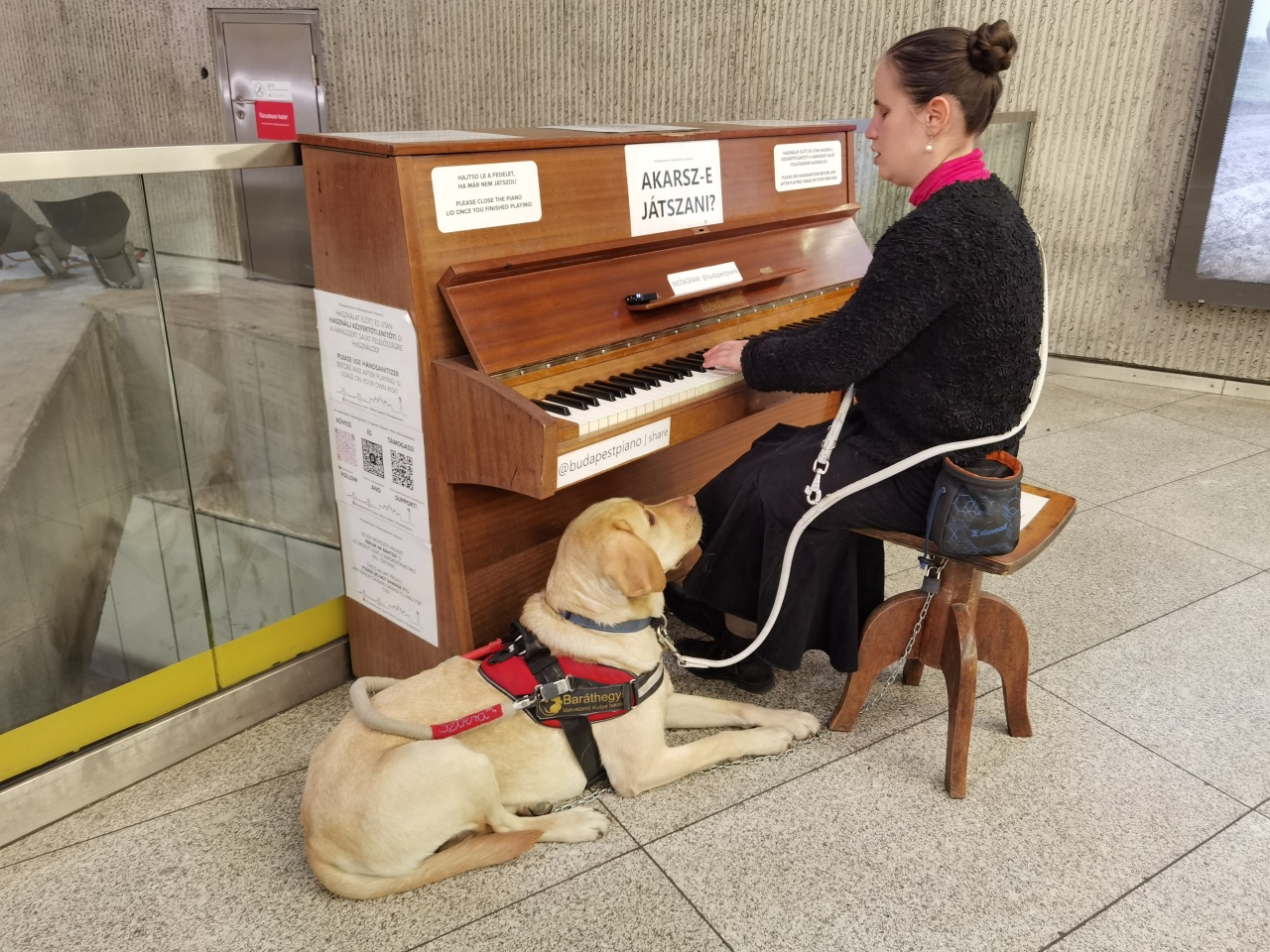 Kardon Annamari köztéri zongorákon gyakorol Budapesten. Ezúttal a Fővám téri metróban játszott. Mindenhová elkíséri a sárga színű 2 éves Szikra, így a zongorajátéka és a vakvezető kutyája miatt is sokan megállnak mellettük. Mindent együtt csinálnak, legutóbb a terepfutást próbálták ki.