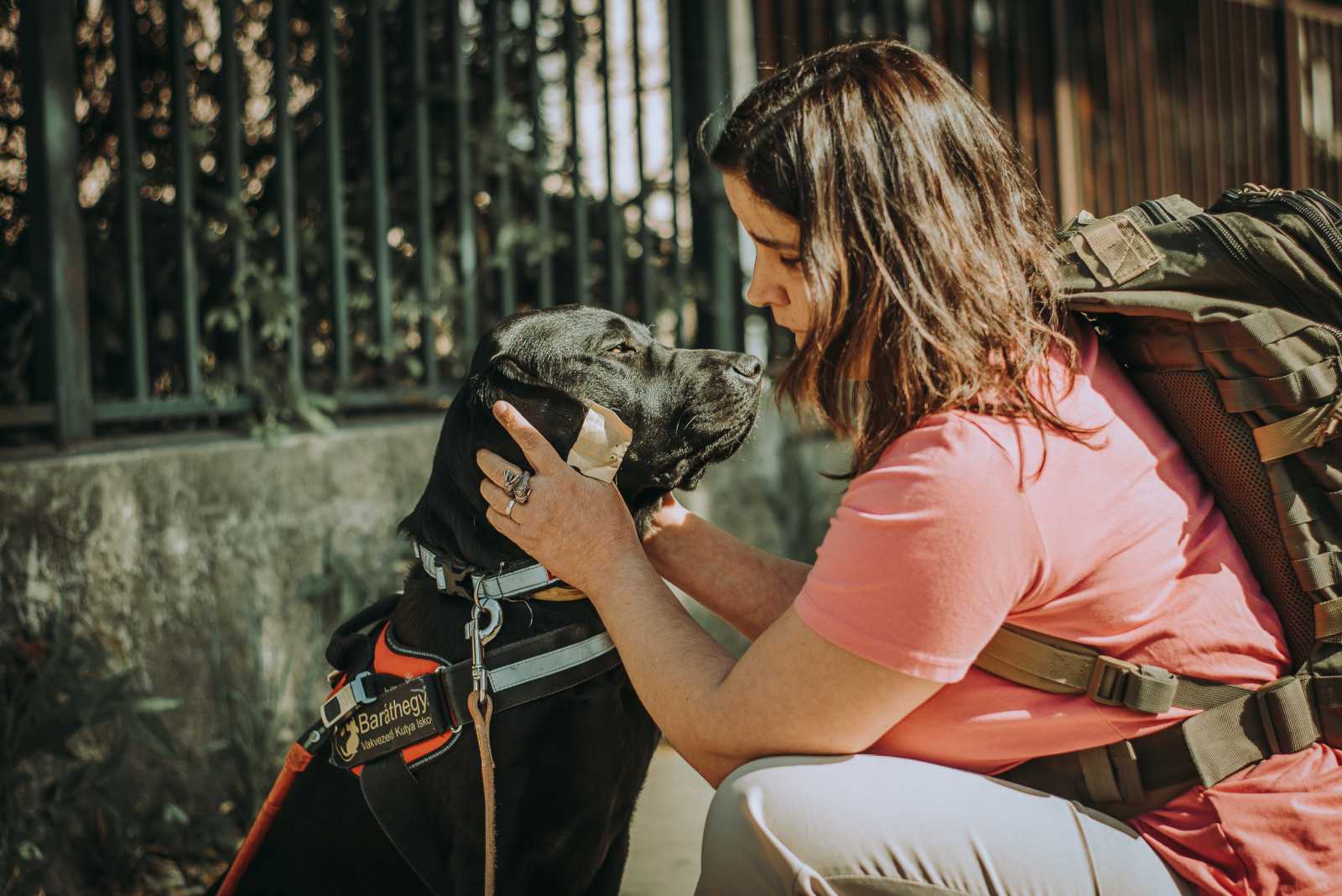 A fiúk iskolájában adtak néhány gézlapot a vérzés elállítására, de ez nem volt elég a mély sebre. Némi kérdezősködés után megtudtam, hogy hol van a közelben állatorvos, és azt, hogyan jutok el oda busszal. Elindultunk. Folyt a vér a szétharapott fülből, úgy vezetett, jelzett minden járdaszegélyt, lépcsőt. Csodálatos társ. Segített, hogy én is segíthessek rajta. Az állatorvosnál kapott gyógyszert, de nem tudták volna azonnal összevarrni a sebét, ezért tovább mentünk az Állatorvostudományi Egyetemre. Altatásban varrták össze, kapott fájdalomcsillapítót, és nem is tudom, hogy dőlt el, ki vezessen kit, mert kissé bódult volt még. Egymást vezettük nagy egyetértésben.