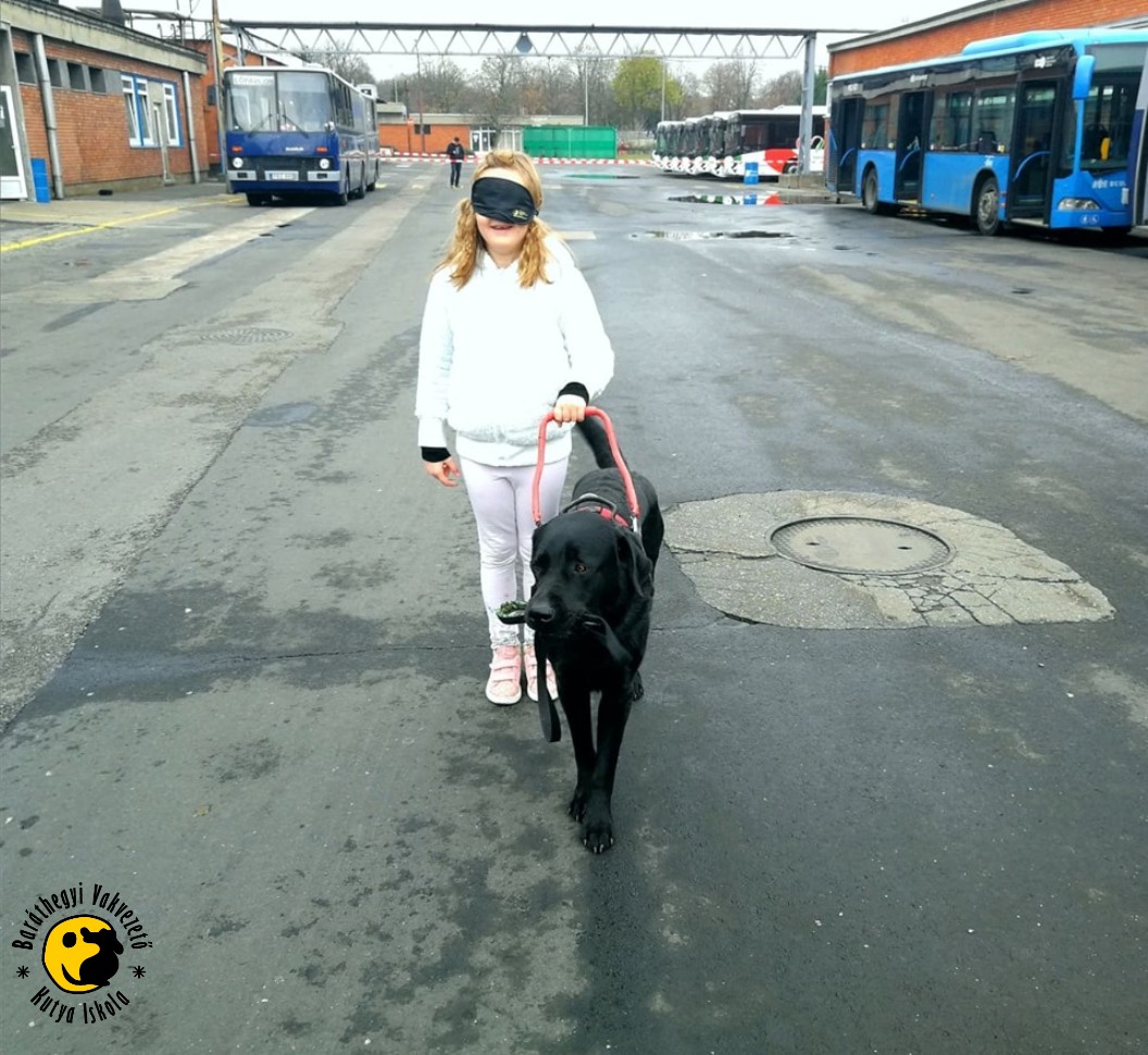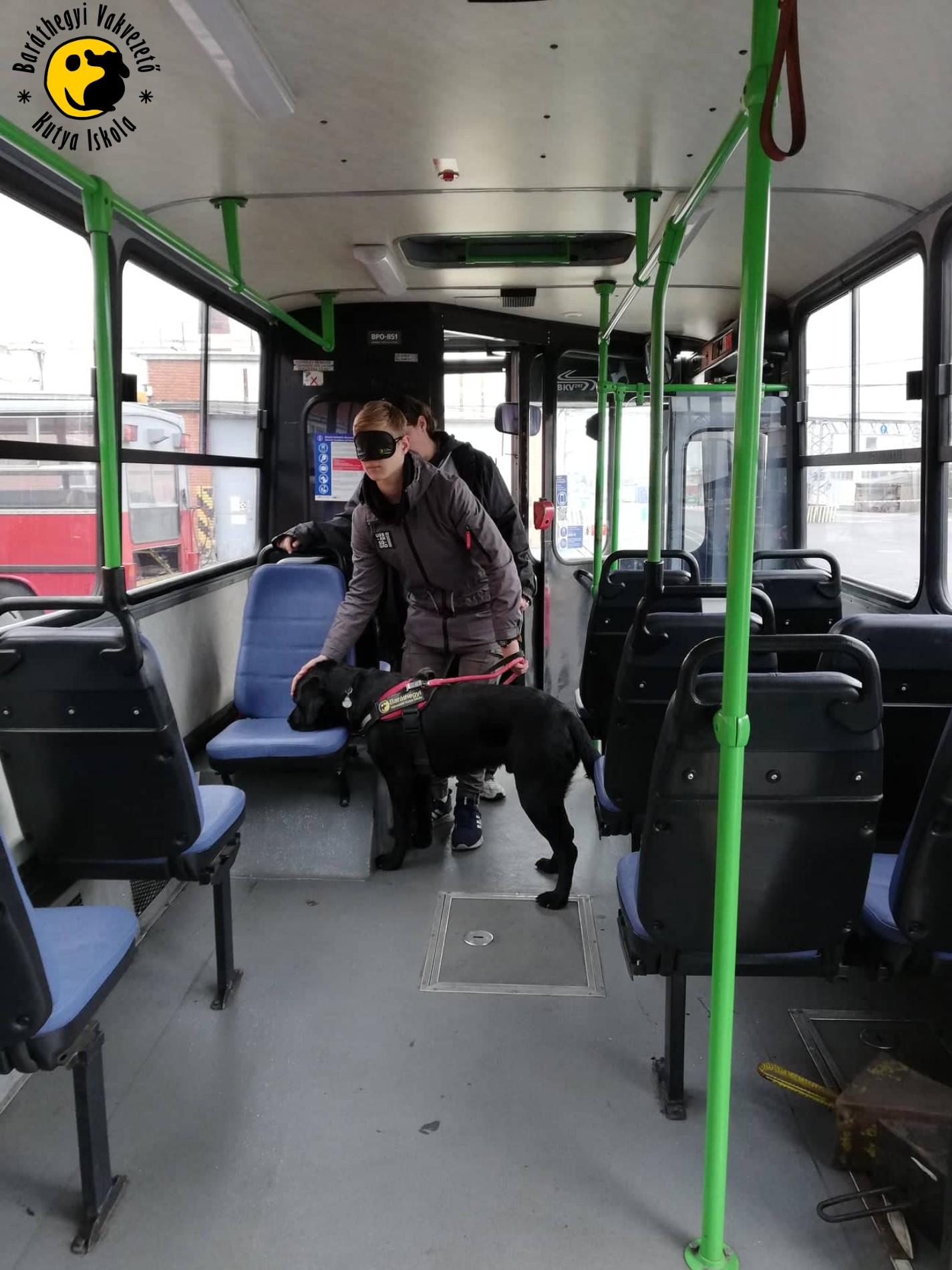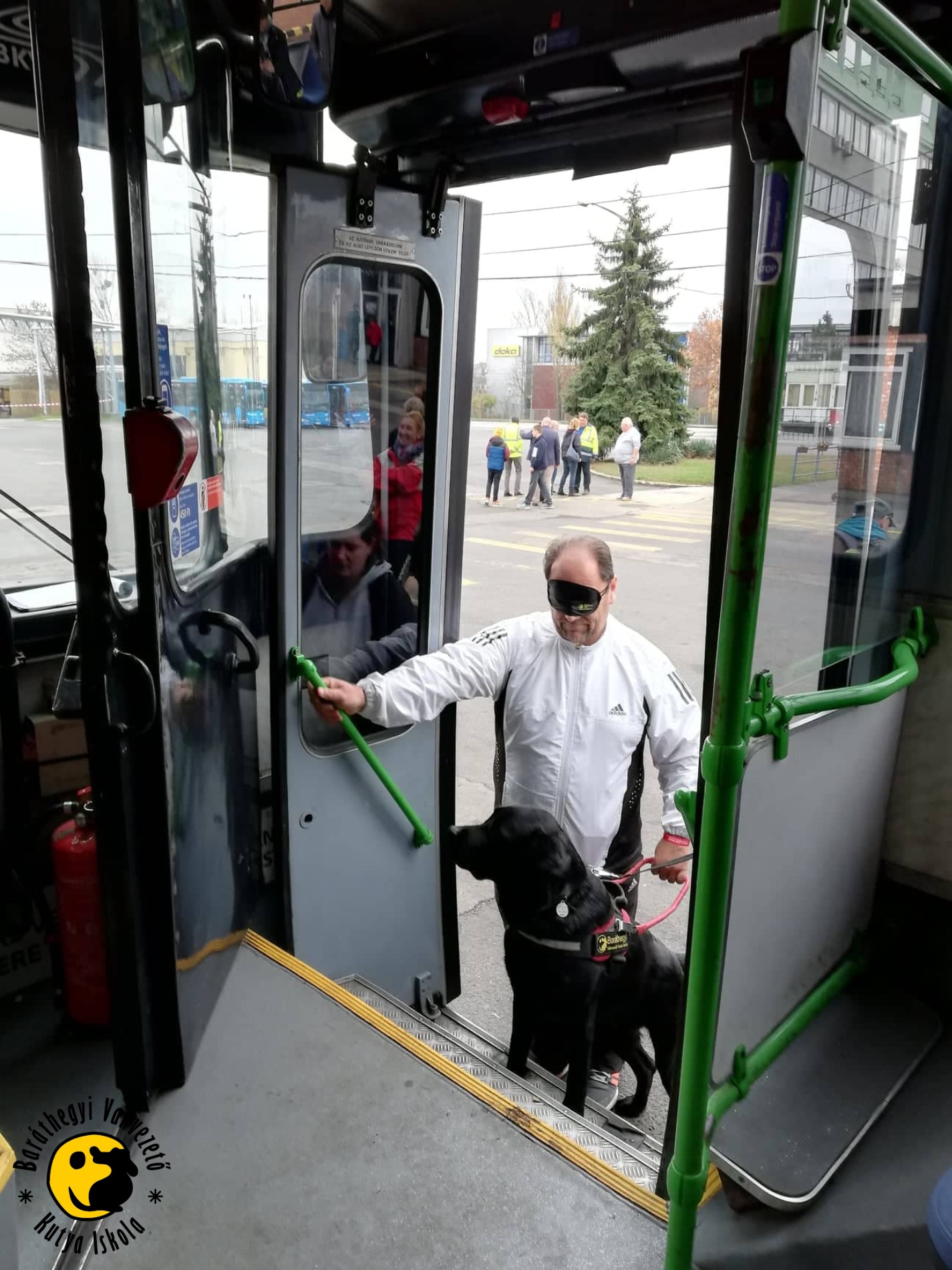 Már levizsgázott vakvezető kutyákkal és vakvezető tanulókkal érkeztünk meg a BKV óbudai autóbuszgarázsába. A buszsofőrök és családtagjaik kipróbálták, hogyan lehet felszállni egy buszra letakart szemmel, vagy milyen érzés néhány métert sétálni egy kutyára bízva magukat.