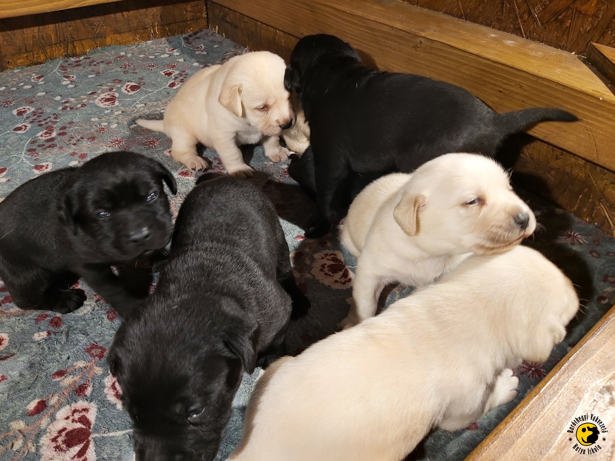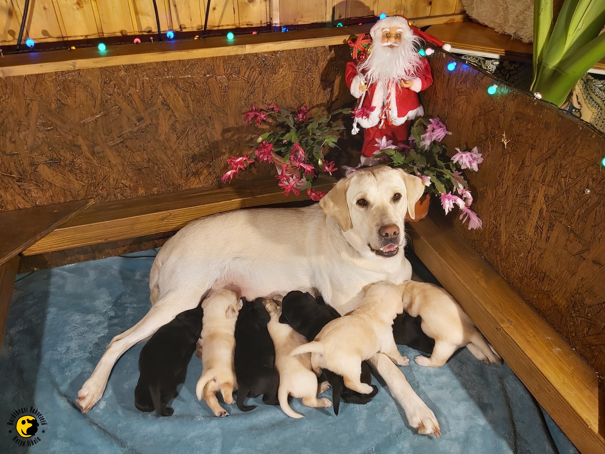 Ebben az alomban négy fekete és négy sárga kölyök van, egyedi kis jelekkel, ezért könnyű őket megkülönböztetni. Legutóbb tizenegy sárga kölyköt nevelt Zina, akiket nem volt ilyen könnyű beazonosítani.