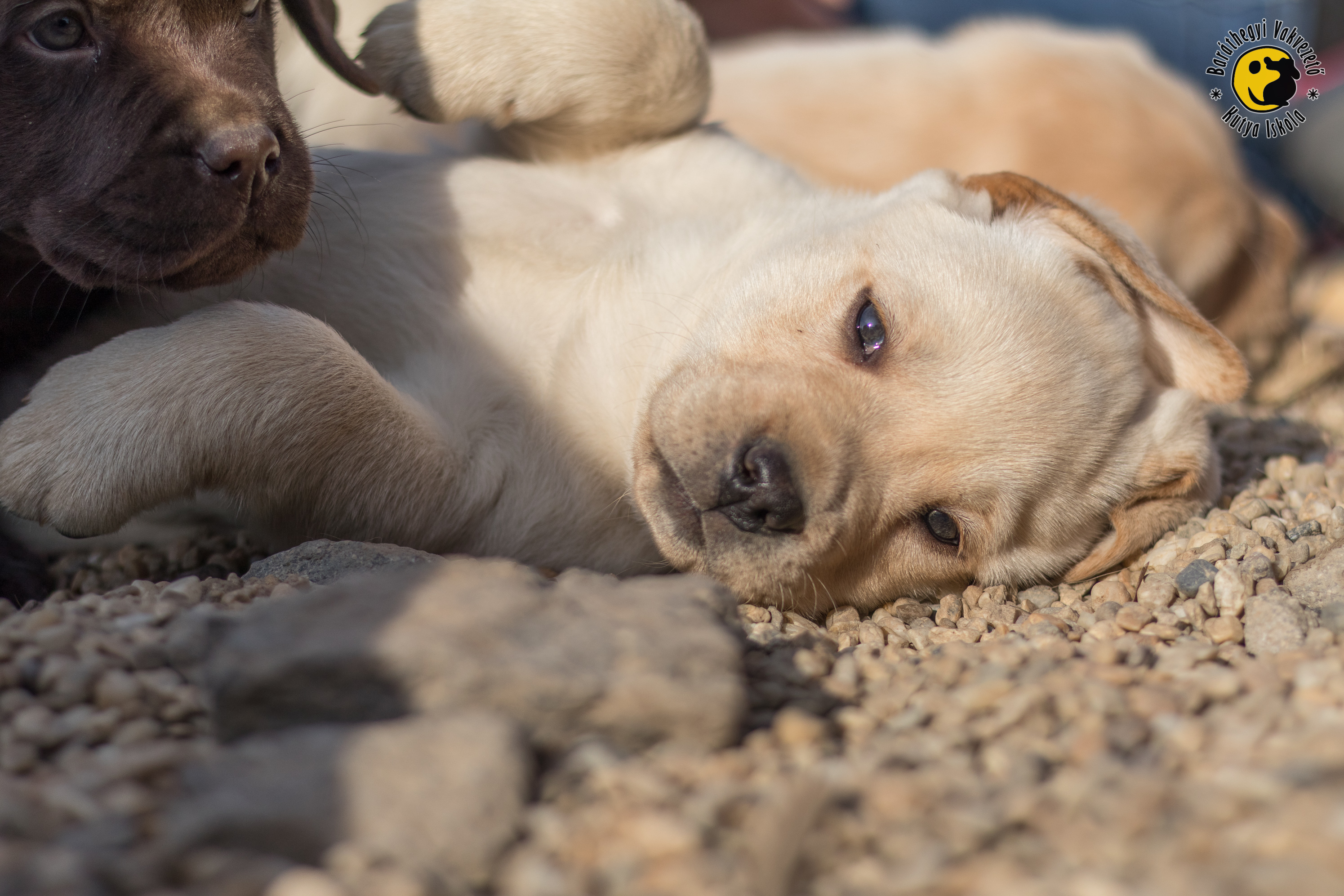 A sárga labrador kölyök napozik, miközben csoki színű testvére játékra hívja