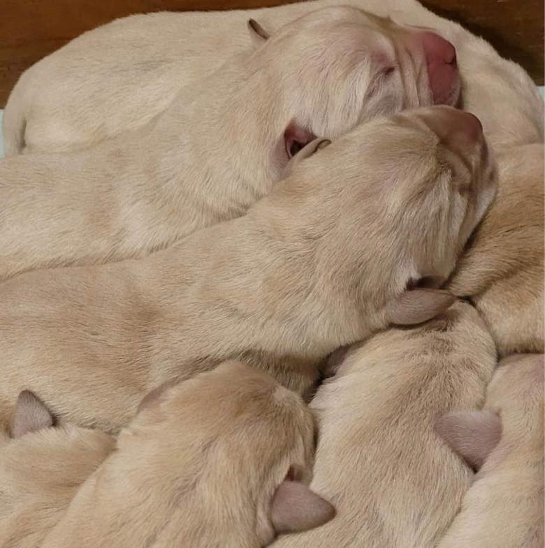 Szellő tíz gyönyörű sárga kölyöknek adott életet május 21-én. A négy lány és a hat fiú remekül érzi magát.