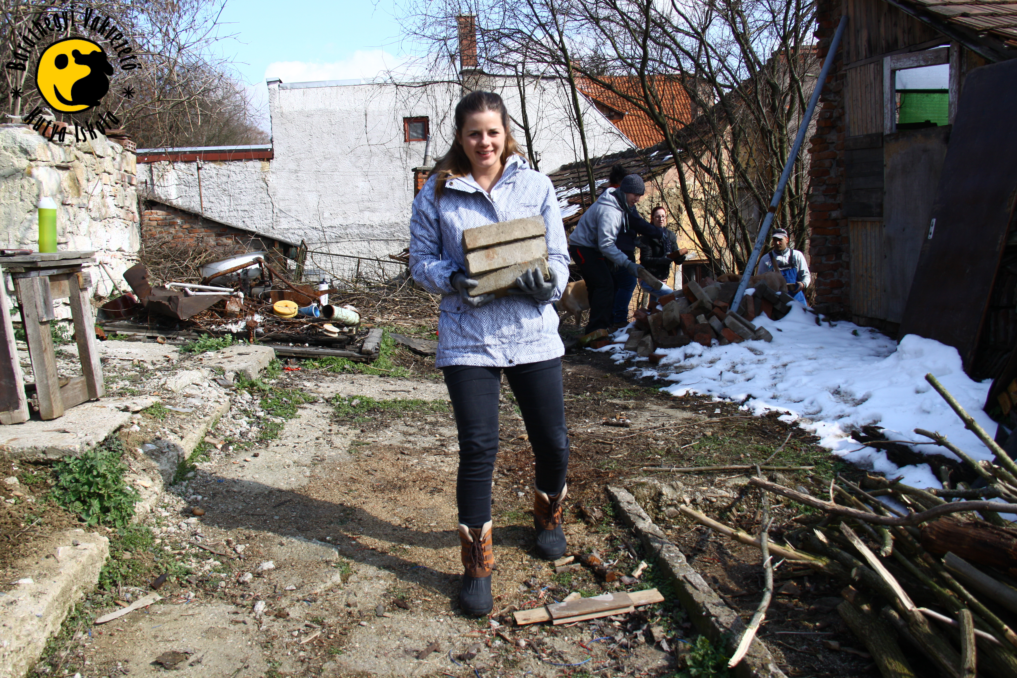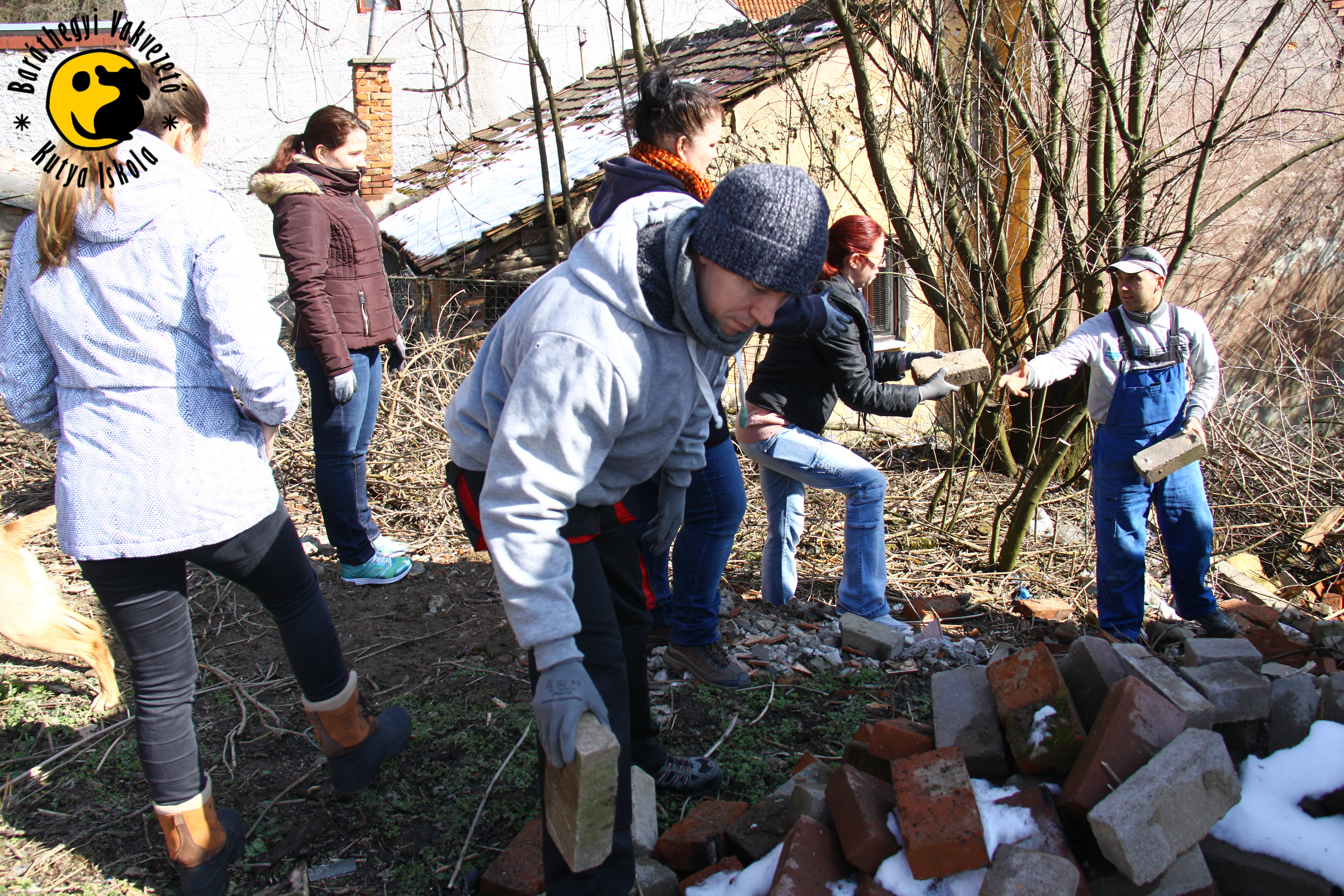 Kis vendégházunkat szeretnénk minél előbb rendezetté tenni, kicsinosítani, és – reméljük – szerencsésnek érzik magukat a vendégeink, hogy az alapok lerakása közben érkeztek 🙂 Egy leomlott fal tégláinak rakodása nem egyemberes munka, ezért jó, hogy sok GE-s állt csatárláncba, és cipelte leendő rendeltetési helyére a téglákat, amiket az udvaron szeretnénk lerakni, hogy megszüntessük a sarat.