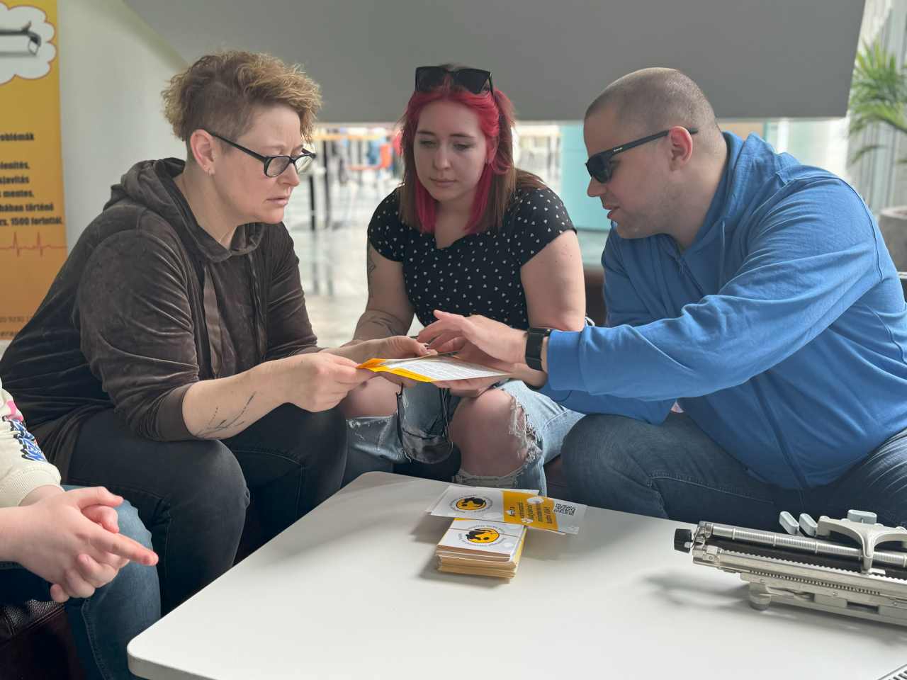 Vida Zoltán kollégánk bemutatta a Braille írást, nemcsak a Braille írógépen, hanem Iphone-on is. Beszélt a számítógép-használatról és az okos eszközökről. Itt éppen azt mutatja, hogyan írta le Braille-ben az egyik önkéntes nevét.